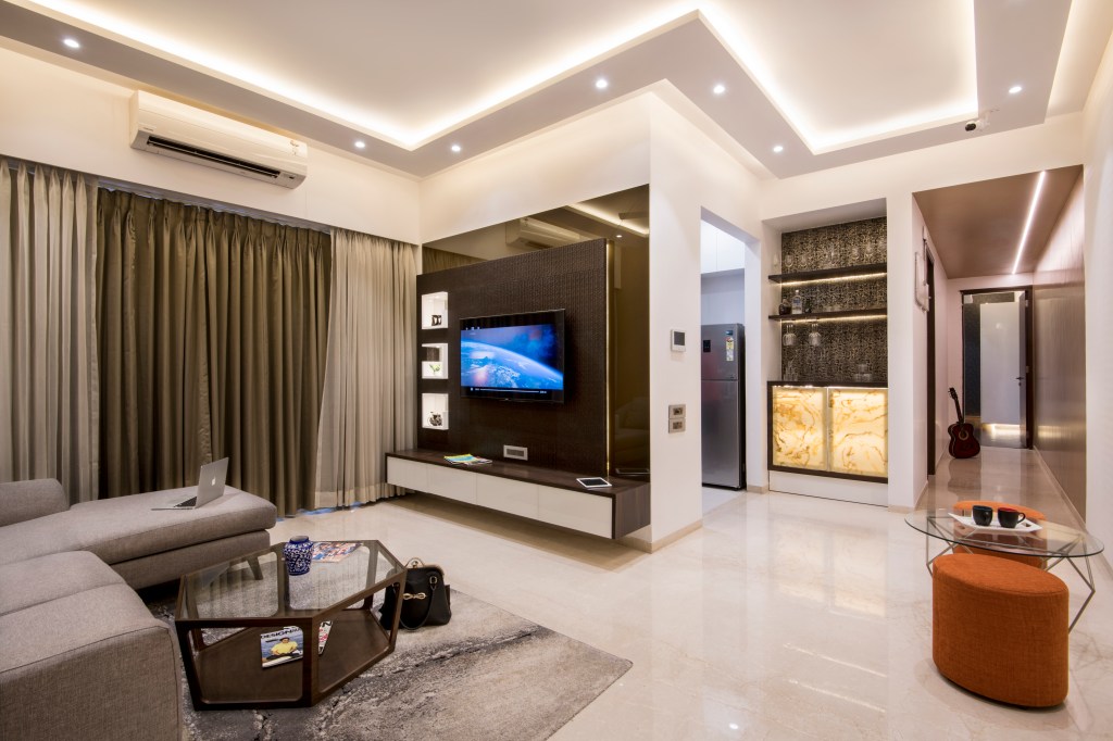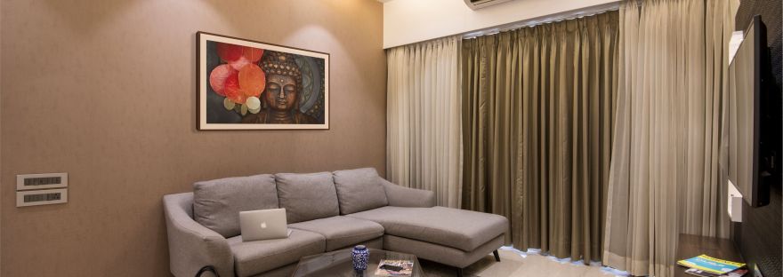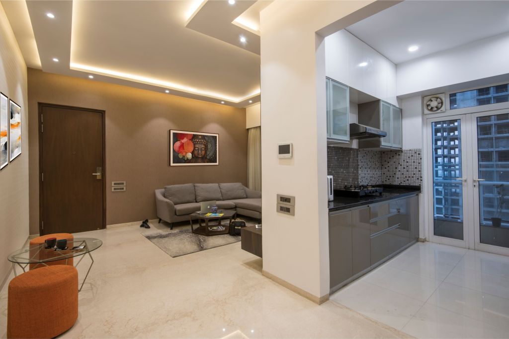 The design for this 2BHK Residential project in Mumbai’s suburban area is a combination of various materials which create an aesthetical appeal to the space while the color hues keeps it tranquil.