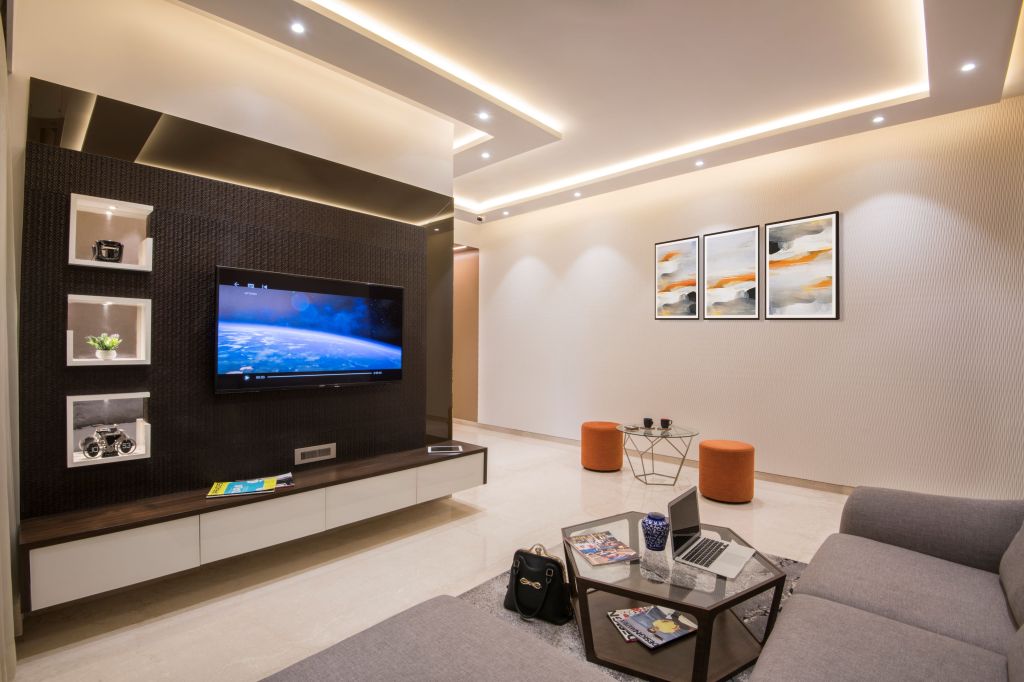 Strategic use of carpets, furniture and decoration has created a spacious, balanced room that is a pleasure to spend time. Selecting a clever color scheme for the walls, adding textures with wallpapers and paneling of Unique material Charcoal panels used for the TV unit, and finding the right balance of furnishings has created something that is relaxing but not cluttered in the space.
