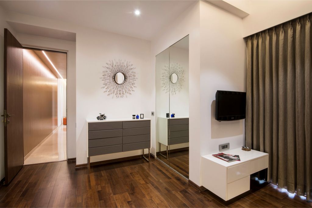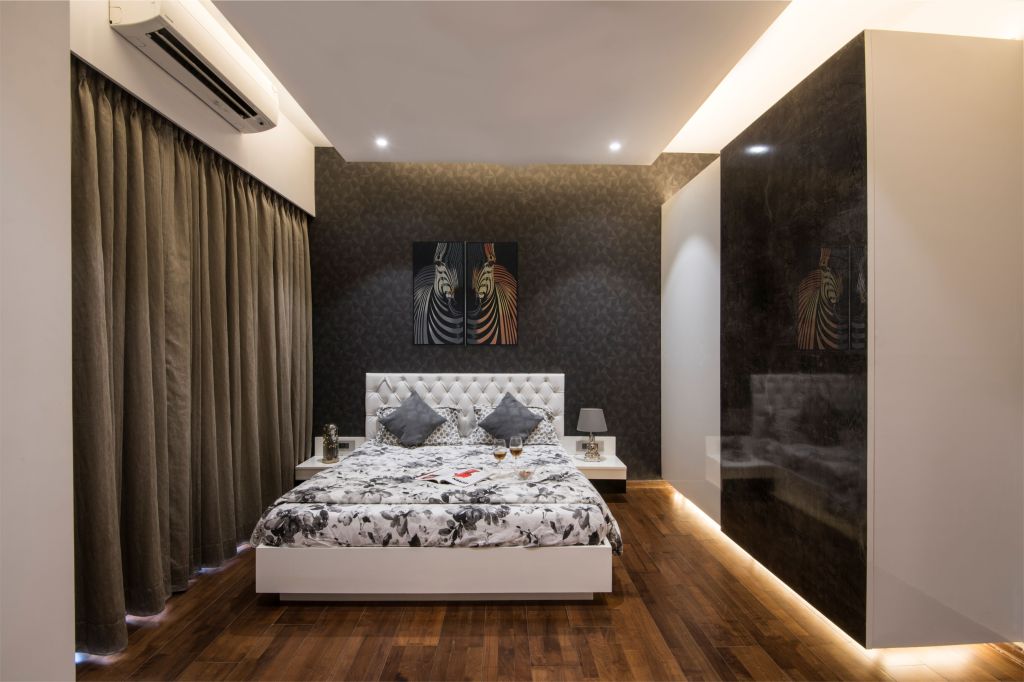 According to the young bachelor, Master bedroom had to be designed as a personal recoil; a well-designed bedroom which needs to be effortless. The contemporary simplicity of this bedroom is balanced against rich textures – the wallpaper which has been taken to full height up to the ceiling , which adds to continuity to the offset ceiling patterns. A high glossy trimmed bed in white color with tufted cushioning backrest against the wall gives the space a desired look.