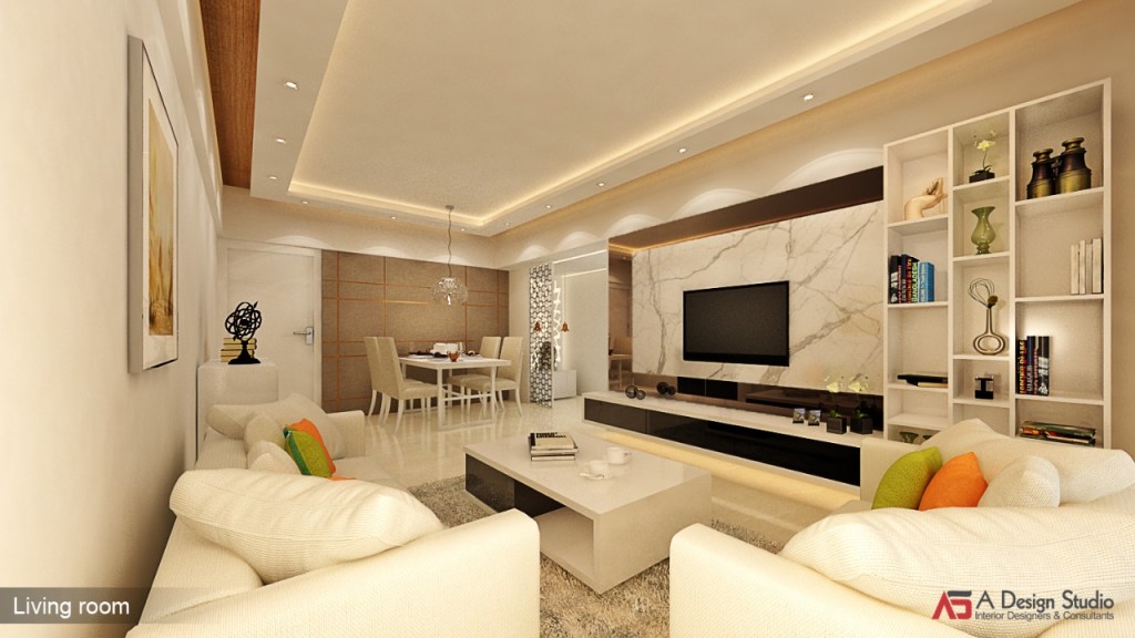 Ceiling is simple cove design with combination of Direct and indirect lights, running beam in between differentiates the Living and Dining areas.